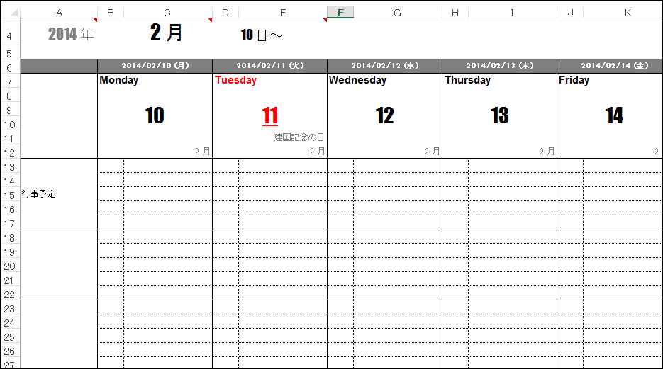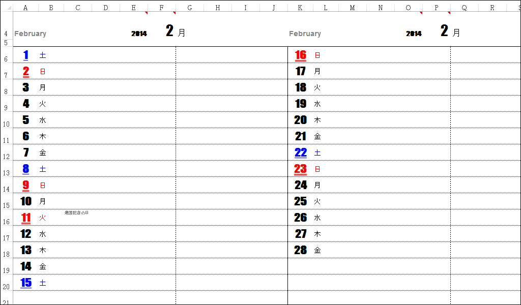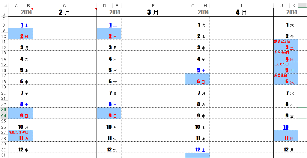 year01.xlsは祝日等を大きく表示する変わりに予定の書き込みができません。それ以外の4種については同様の形式になっています。表のカスタマイズがしやすく、列を追加し担当者毎に予定を入力するといった使い方も可能です。(列追加後に罫線の調整は必要です。)